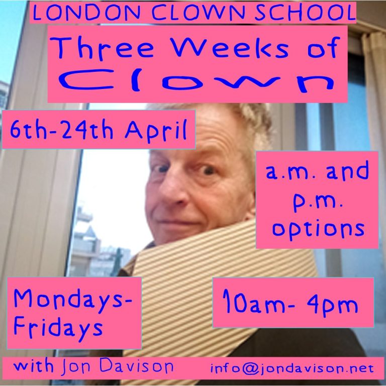The Three-Week Clown Course starts with the fundamentals of clowning and works towards creating your own clown performance in the way that suits you and performing it in the place that suits you.